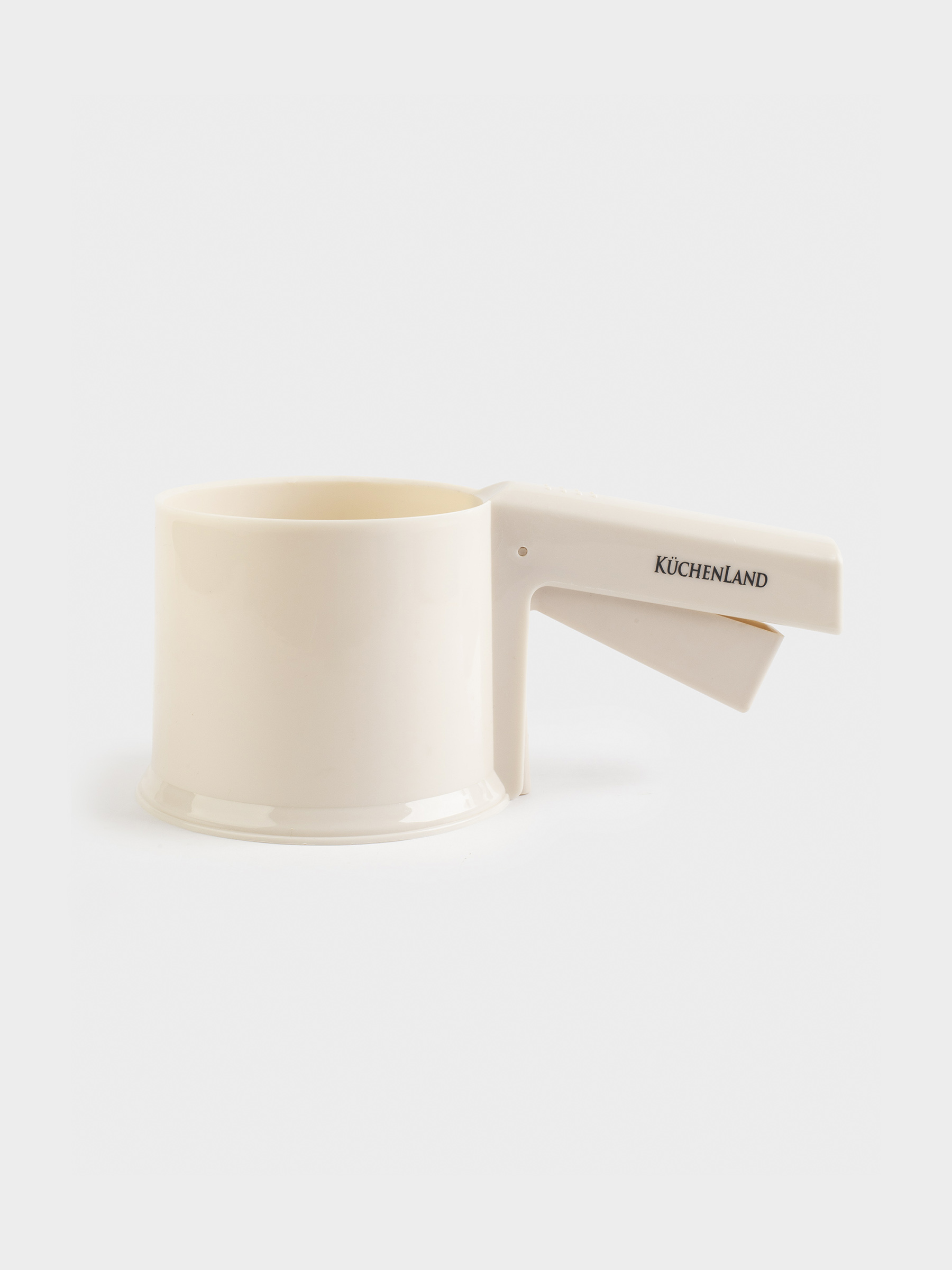 Flour sifter. Size: 21x10x9 cm. Volume: 350 ml. Material: stainless steel, rubber. Care instructions: wash with mild detergents. Can be washed in the dishwasher.